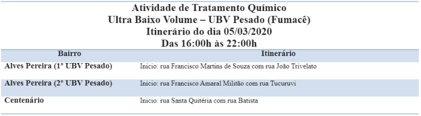 Dois bairros da cidade irão receber o serviço de borrifação Ultra Baixo Volume (UBV), Fumacê, a partir do final da tarde desta quinta-feira (5). As equipes passarão pelo Alves Pereira e Centenário.
