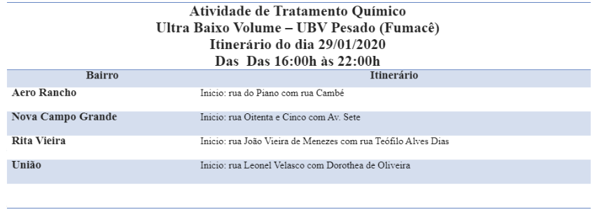 O serviço de borrifação Ultra Baixo Volume (UBV), Fumacê, intensifica o combate ao mosquito Aedes aegypti, nesta quarta-feira (29), nos bairros Aero Rancho, Nova Campo Grande, Rita Vieira e União.