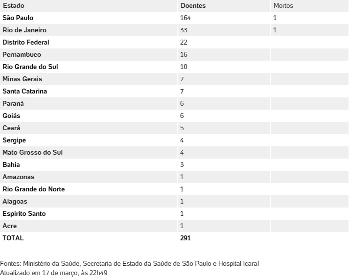 Até ontem os números do Ministério da Saúde apontavam 291 casos de coronavírus no Brasil e 8.819 casos suspeitos. Ontem também foi confirmada a primeira morte em função do covid-19, em São Paulo.