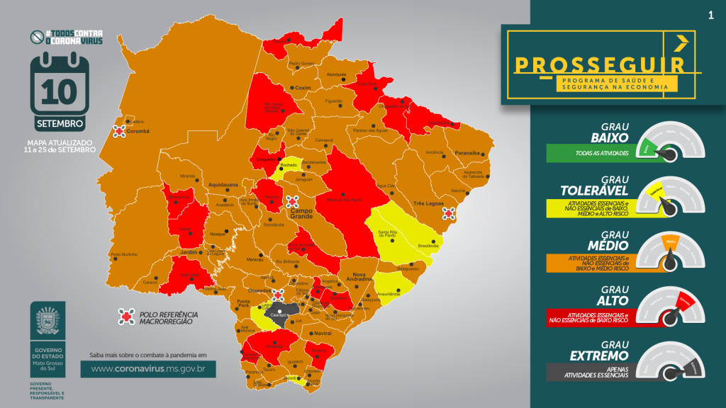 Os mapas situacionais atualizados, recomendações para os municípios e a distribuição das atividades econômicas por faixa de risco, estão disponíveis no site www.coronavirus.ms.gov.br (link prosseguir).