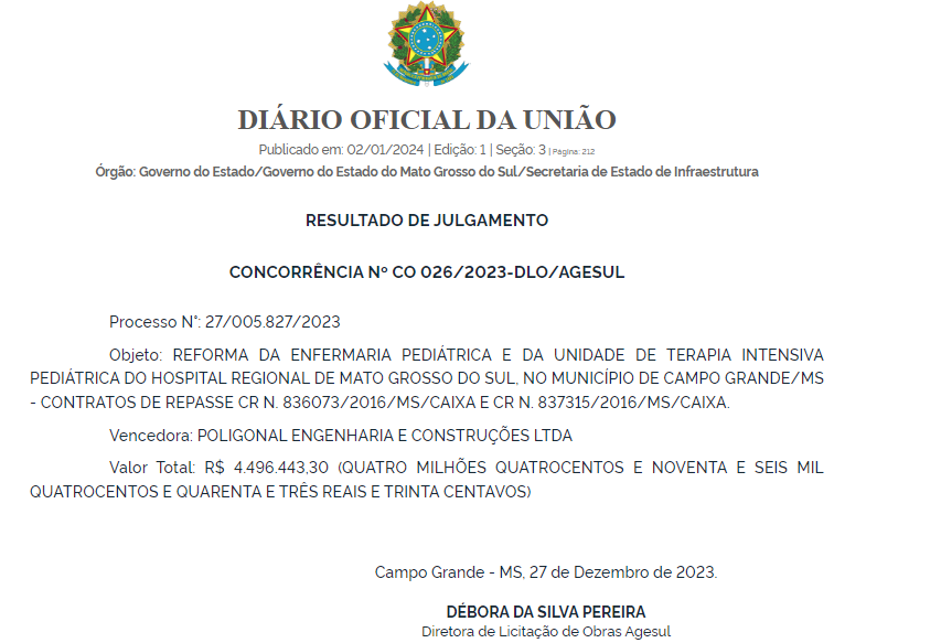 O Governo do Estado de Mato Grosso do Sul anunciou, por meio do Diário Oficial da União desta terça-feira (02), a realização de uma reforma nas instalações da Enfermaria Pediátrica e da Unidade de Terapia Intensiva Pediátrica do Hospital Regional.