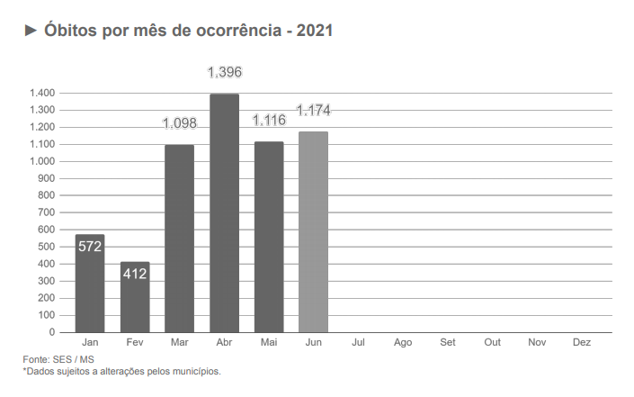 Boletim epidemiológico desta terça-feira (29) registra mais 30 óbitos decorrentes da covid-19, com isso, MS chega a 8.153 mortes desde o início da pandemia, sendo 1.174 apenas no mês de junho. Esse é o segundo mês com o maior número de mortos, ficando atrás apenas de abril, que teve 1.396 óbitos registrados.