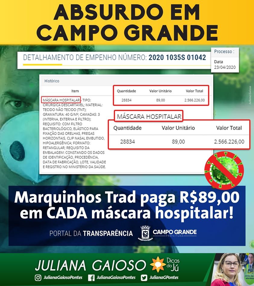 Uma publicação que está circulando na internet afirma que a prefeitura de Campo Grande comprou máscaras cirúrgicas por R$ 89,00 cada, um valor, que se real, seria absurdo. O prefeito Marquinhos Trad desmentiu a publicação durante em uma live oficial nesta segunda-feira (26).