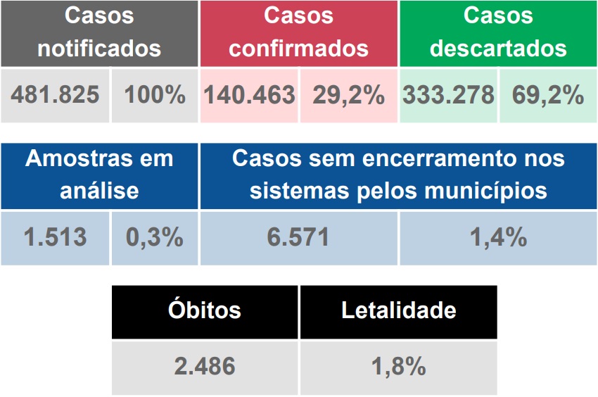 Conforme o boletim, MS já soma 481.825 casos notificados, dos quais 333.278 foram descartados. Há 1.513 amostras em análise no Laboratório Central de Mato Grosso do Sul (Lacen-MS) e 6.571 casos ainda aguardam encerramento pelos municípios.