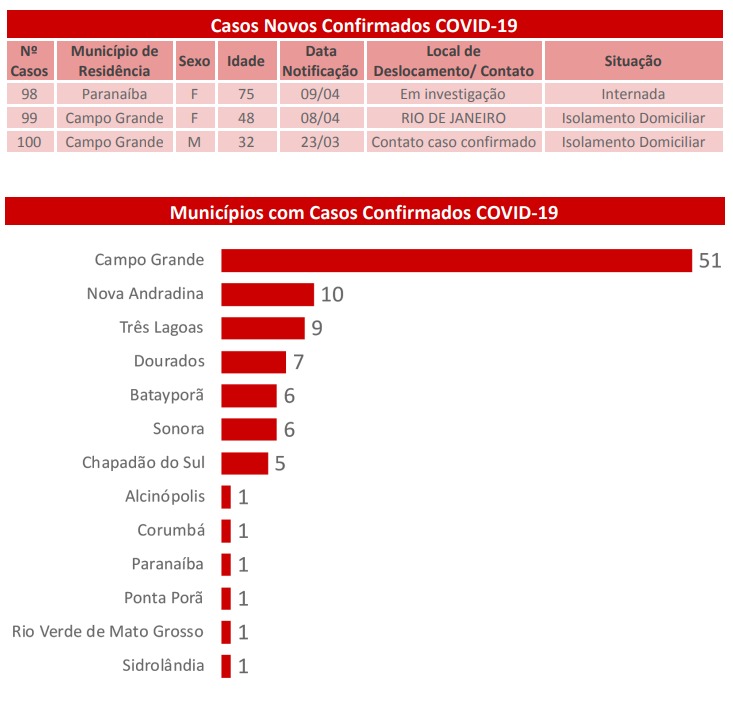 Dos novos infectados, 2 são de Campo Grande, sendo um homem de 32 anos, e uma mulher de 48 anos. O outro caso é de uma idosa de 75 anos em Paranaíba.