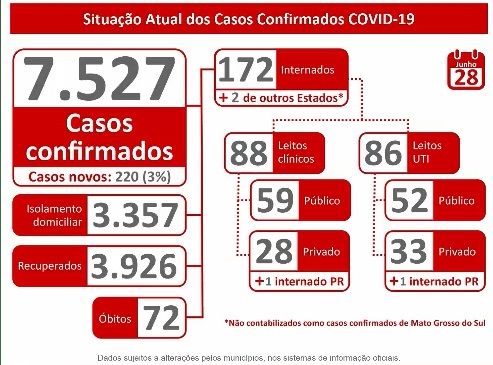 A Secretaria de Estado de Saúde (SES) informou na manhã deste domingo (28) que Mato Grosso do Sul registrou em 220 o total de infectados na última 24 horas do novo coronavírus (Covid-19). Porém, a SES adverte que o “número baixo” de notificações se deve ao fato de que muitos municípios não têm equipes o suficiente para registrar todos os dados e, por esse motivo, nos próximos dias os registros podem aumentar de forma considerável.