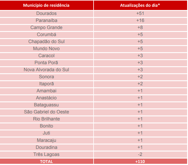 Foi registado também mais duas mortes em Dourados e uma morte em Anastácio. Dos 110 novos casos registrados nessas 24h, 51 são em Dourados, enquanto Campo Grande foram 8 e mais 16 em Paraíba.