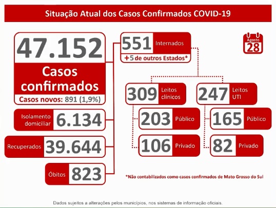O Estado de MS confirmou mais 891 casos e 23 novas mortes por Coronavírus. Oito pessoas que perderam a vida pela doença, eram moradoras da Capital. O número de infectados já chega a 47.152. Segundo a Secretaria de Saúde (SES), 39.644 já estão curados e 6.134cumprem isolamento domiciliar. No total, 823 perderam a vida para o Coronavírus. O mês de agosto já registrou 203 óbitos, já são 71 mortes a mais que no mês de julho.