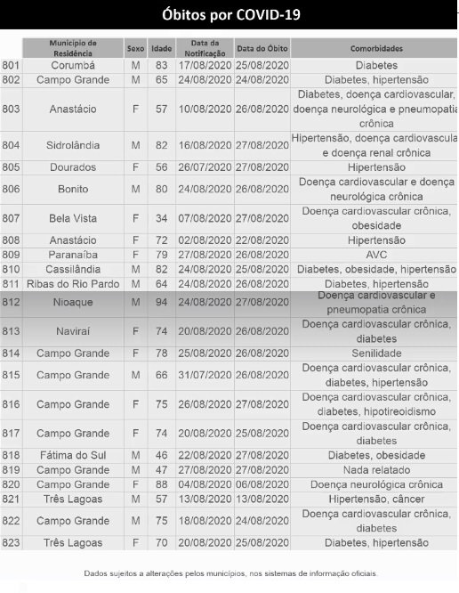 Dos 23 óbitos, foram oito de Campo Grande, dois de Anastácio e Três Lagoas, um de Sidrolândia, Ribas do Rio Pardo, Paranaíba, Nioaque, Naviraí, Fátima do Sul, Dourados, Corumbá, Cassilândia, Bonito e Bela Vista.