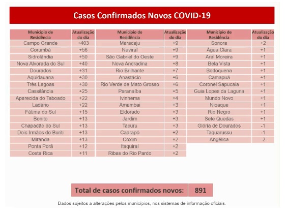 De acordo com a SES, dos 891 novos casos, 403 são de moradores de Campo Grande, Corumbá registrou 56, Sidrolândia 50 caso. A Capital já contabiliza um total de 20.505 registros da doença. Dourados tem 5.382 e Corumbá já registrou 2.465 casos. Confira na tabela abaixo os outros municipios.