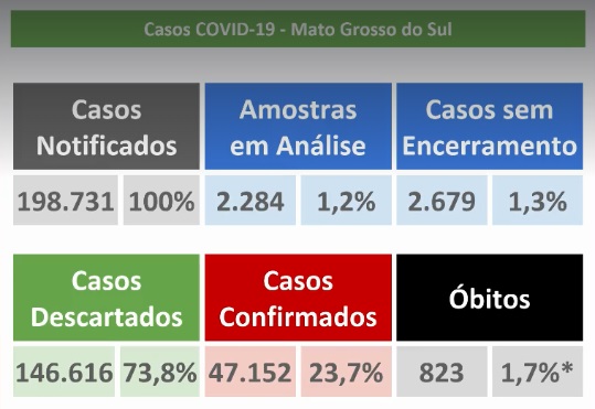 Conforme o boletim, MS já soma 198.731 casos notificados, dos quais 146.616 foram descartados. Há 2.284 amostras em análise no Laboratório Central de Mato Grosso do Sul (Lacen-MS) e 2.679 casos ainda aguardam encerramento pelos municípios.