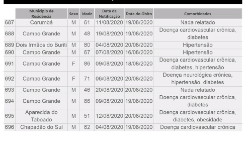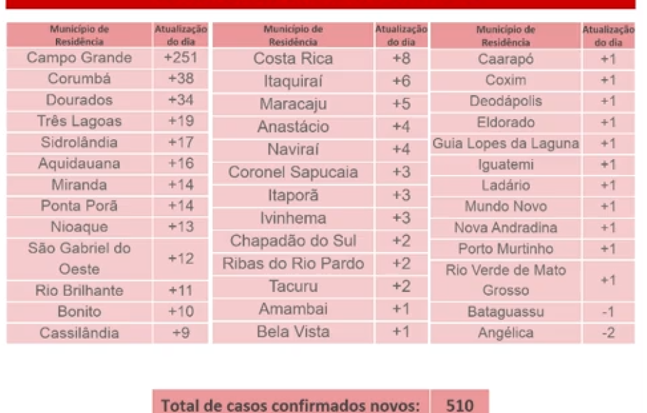 Do total de novos casos, as três cidades que mais tiveram foram Campo Grande com 251, Corumbá com 38 e Dourados com 34 casos. Também foram registradas 10 mortes em todo o estado, que já totaliza 696 óbitos causados pela doença.