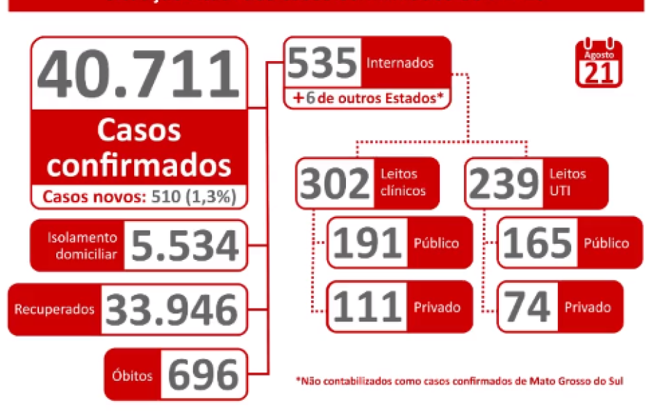 Mato Grosso do Sul registra nas últimas 24 horas 510 novos casos confirmados de coronavírus e mais 10 mortes e com isso o estado alcança os 40.711, nesta sexta-feira (21), de acordo com o boletim epidemiológico da Secretaria Estadual de Saúde (SES).