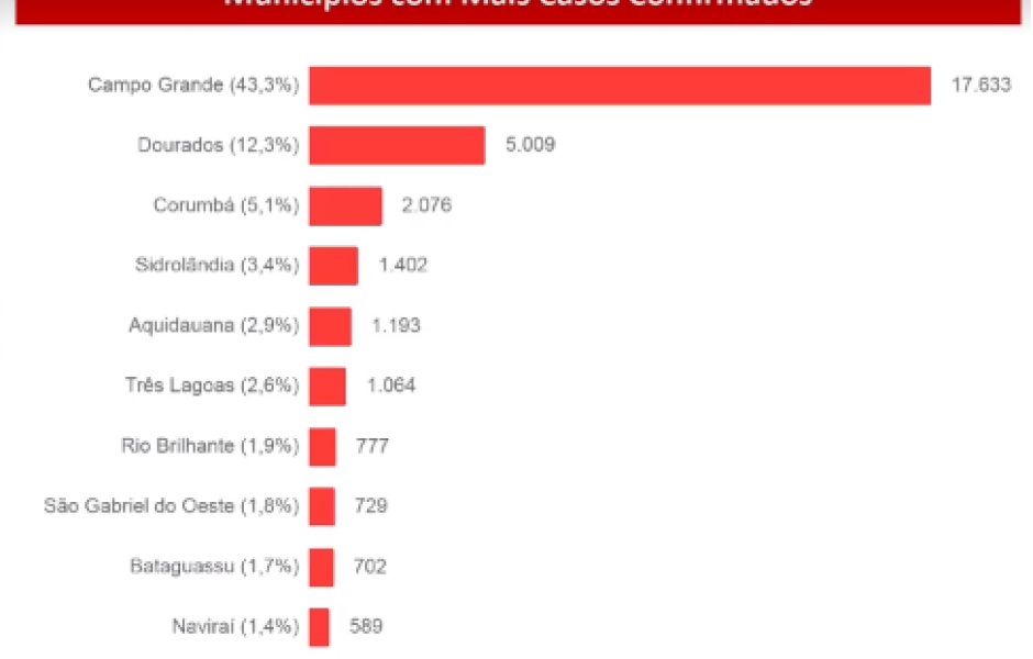 Campo Grande é o atual epicentro no estado e lidera o número de casos totais com 17.633 confirmações, seguido por Dourados com 5.009 e Corumbá com 2.076.