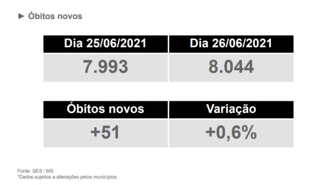De acordo com o registro da Secretaria de Estado de Saúde, as 51 novas mortes aconteceram nos seguintes municípios de residência: Campo Grande (24 mortes); Dourados teve 6 mortes, Bataguassu Miranda 2, e Ponta Porã, Naviraí, Corumbá, Coxim, Corguinho, Douradina, Bodoquen, Paranaíba, Maracaju, Paraíso das Águas, Anastácio e Três Lagoas tiveram um óbito cada.