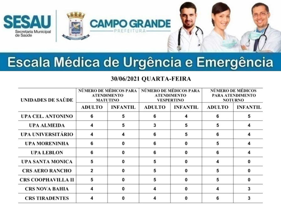 A escala de médicos e pediatras nas Unidades de Pronto Atendimento (UPAs) e Centros Regionais de Saúde (CRS’s), nesta quarta-feira (30), em Campo Grande, conta com 45 clínicos gerais e 14 profissionais de atendimento infantil apenas no período da manhã.