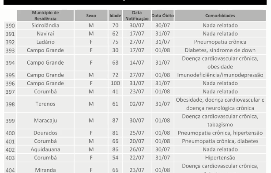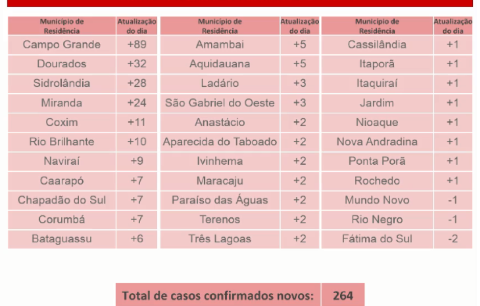 Do total de novos casos, as três cidades que mais tiveram foi Campo Grande com 89, Dourados com 32 e Sidrolândia com 28 casos. Também foram registradas 15 mortes em todo o estado, que já totaliza 404 óbitos causados pela doença.
