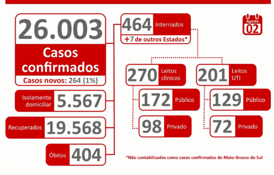 Mato Grosso do Sul registra nas últimas 24 horas 264 novos casos confirmados de coronavírus e mais 15 mortes e com isso o estado alcança os 26.003, neste domingo (2), de acordo com o boletim epidemiológico da Secretaria Estadual de Saúde (SES).