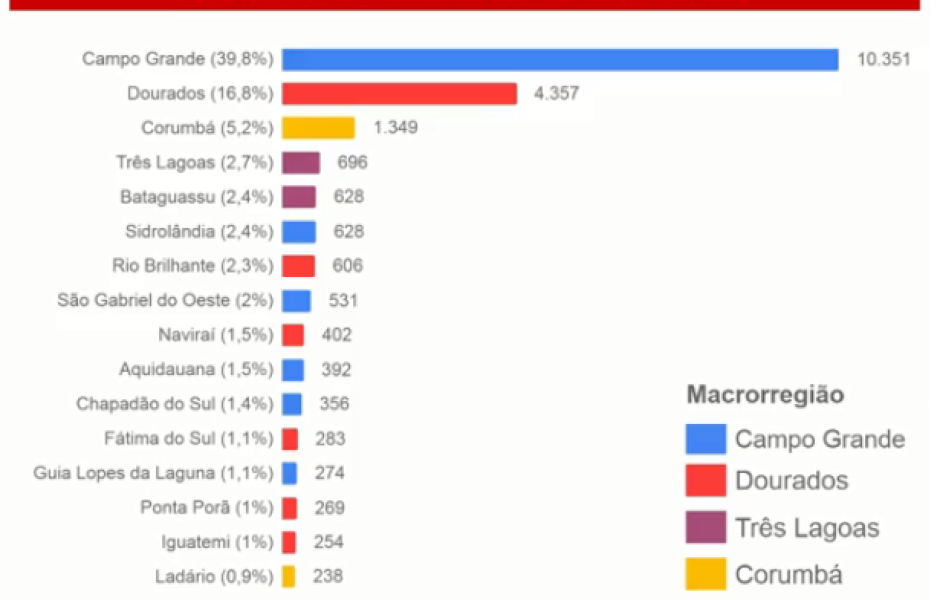 Campo Grande é o atual epicentro no estado e lidera o número de casos totais com 10.351 confirmações, seguido por Dourados com 4.357 e Corumbá com1.349.