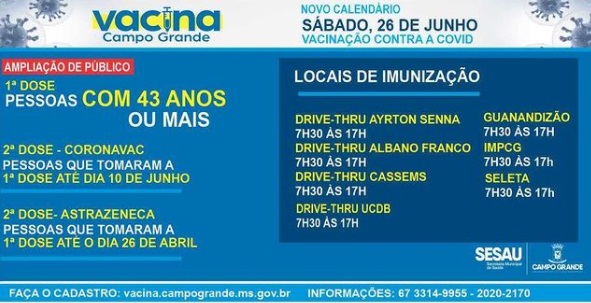Neste sábado (26), a Prefeitura de Campo Grande ampliou a vacinação contra a Covid-19 para pessoas com 43 anos ou mais neste sábado, dia 26 de junho. O atendimento segue para os demais públicos estabelecidos no calendário divulgado previamente pela Secretaria Municipal de Saúde (Sesau).