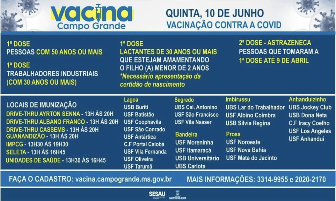 A Secretaria Municipal de Saúde - Sesau convoca pessoas com 50 anos ou mais para receberem a primeira dose da vacina contra o coronavírus nesta quinta-feira (10) em um dos diversos pontos espalhados por Campo Grande.
