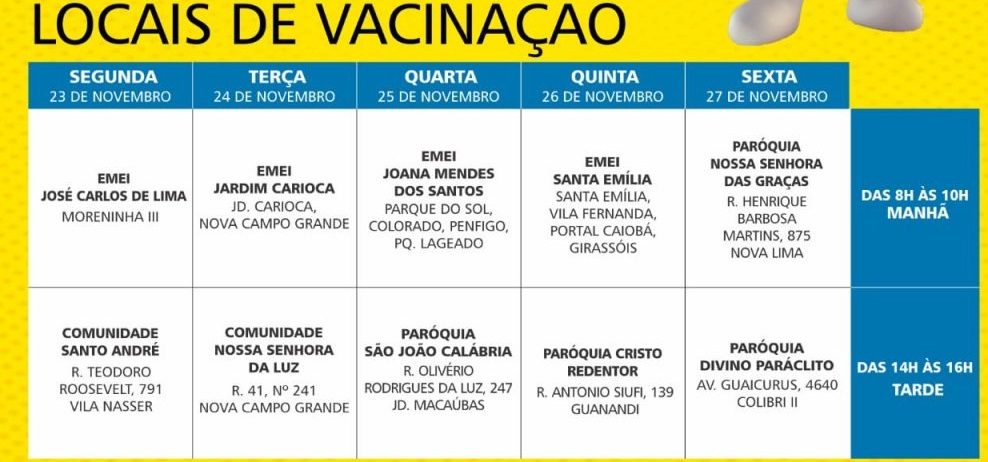 Serão montados dois pontos por dia, em locais e horários distintos. Esses locais de vacinação funcionarão em dois períodos, sendo pela manhã, em sua maioria, as escolas, e à tarde as igrejas.
