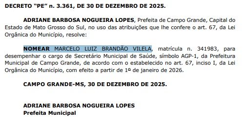 Após meses sem comando, a Secretaria Municipal de Saúde de Campo Grande (Sesau) terá um novo titular. O médico Marcelo Luiz Brandão Vilela foi nomeado pelo decreto “PE” nº 3.361, assinado pela prefeita Adriane Lopes, publicado no Diário Oficial do Município, com efeitos a partir de 1º de janeiro de 2026.