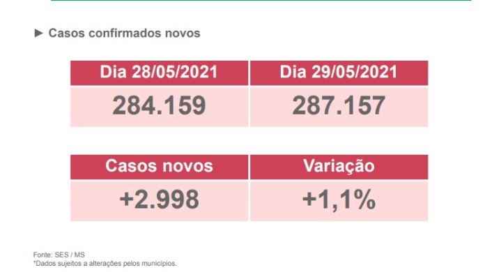 Mato Grosso do Sul confirmou 2.998 casos novos de Covid-19 e atingiu neste sábado (29), o número de 287.157 infectados com o novo coronavírus. Maio já registra o maior número de contaminados em um mês de toda a pandemia.