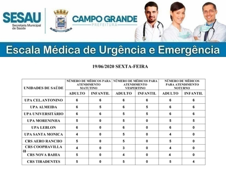 As Unidades de Pronto Atendimento (UPAs) de Campo Grande atendem nesta sexta-feira (19), pela manhã, com 17 pediatras e 52 médicos clínicos gerais.