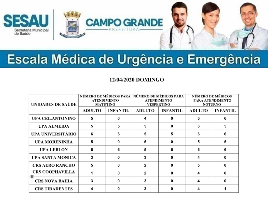 Atenderão na manhã deste domingo (12) em Campo Grande, 40 médicos para atendimento especializado adulto, que estarão disponíveis em todas as Unidades de Pronto Atendimento (UPA’s).