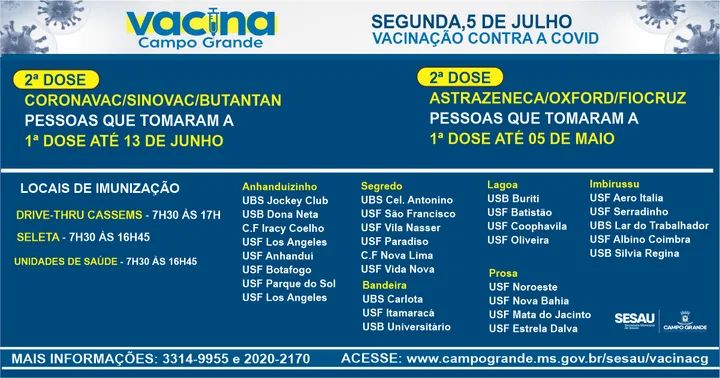 A Prefeitura de Campo Grande, através da Secretaria Municipal de Saúde (Sesau), realiza nesta segunda-feira (5), a vacinação exclusivamente para 2ª dose, tanto de Coronavac, quanto de AztraZeneca.