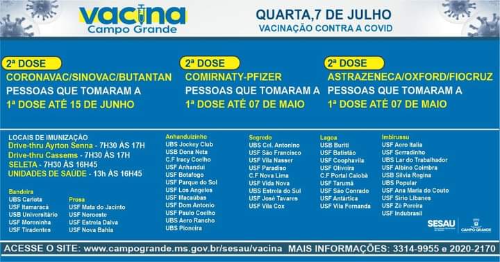 A vacinação contra a covid-19 será exclusivamente para a aplicação da segunda dose nesta quarta-feira (7) em Campo Grande. A aplicação das doses inicia às 7h30 nos Drive-thru e Seleta, já nas unidade de saúde, o atendimento começa pelas 13h.