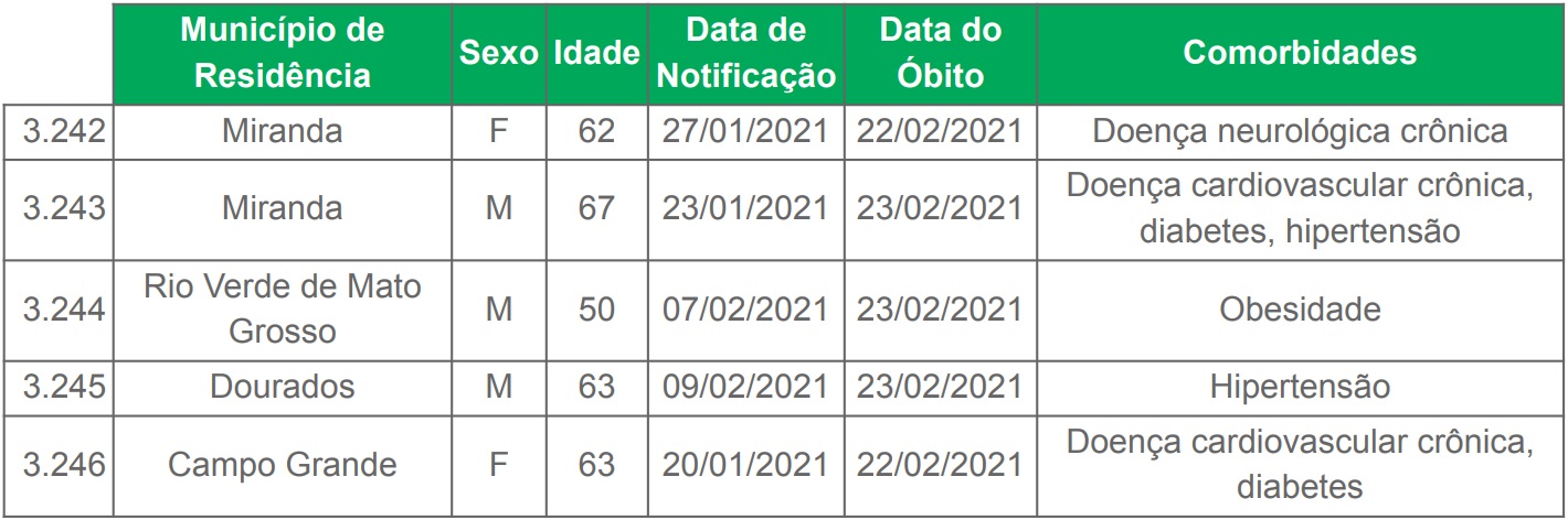 Conforme o boletim epidemiológico, foram registrados 5 óbitos, dois foram em Miranda, e nos municípios de Campo Grande, Dourados e Rio Verde do Mato Grosso tiveram uma mortes.
