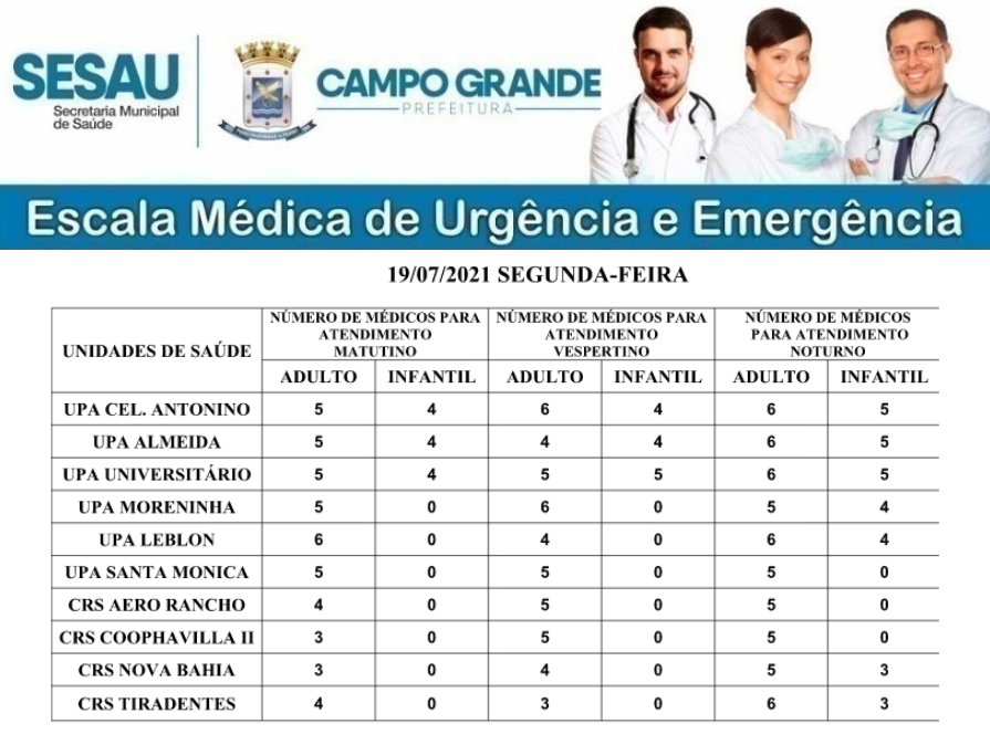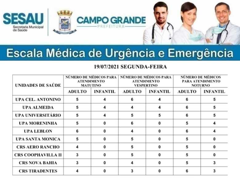 A Secretaria Municipal de Saúde Pública (Sesau) divulgou a escala de médicos para atendimento de urgência nas Unidades de Pronto Atendimento (UPAs) e Centros Regionais de Saúde (CRSs) de Campo Grande nesta segunda-feira (19).