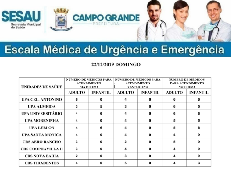 Para as crianças, no período vespertino não haverá médicos de plantão. O que melhora à noite com 31 médicos disponíveis, em todas as unidades exceto, no CRS Nova Bahia, CRS Coophavilla II, CRS Aero Rancho, e UPA Santa Mônica.