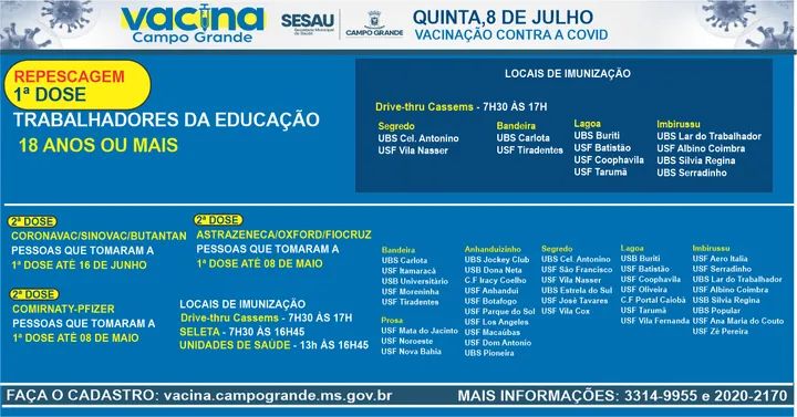 A vacinação contra a covid-19 nesta quinta-feira (8) em Campo Grande, será de repescagem para a primeira dose dos trabalhadores da educação e terá a aplicação da segunda dose. As doses começam a ser aplicadas às 7h30 nos Drive-thru e Seleta, já nas unidade de saúde, o atendimento começa pelas 13h.