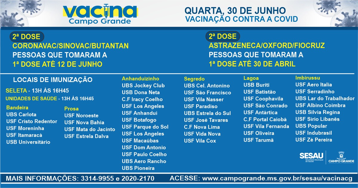 Novamente nesta quarta-feira (30) a Prefeitura de Campo Grande mantém o esquema de vacinação somente para aplicação da segunda dose de Coronavac-Sinovac-Butantan e Astrazeneca-Oxford-Fiocruz. As pessoas aptas devem se encaminhar a Seleta ou a uma das unidades básicas para receber a vacina.