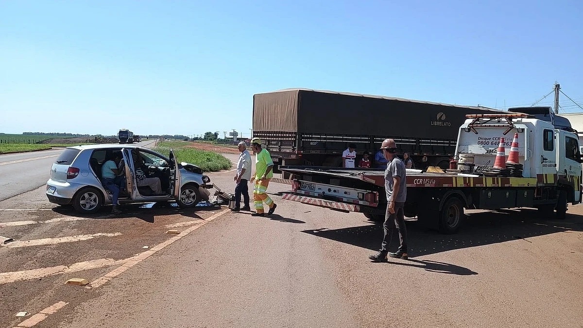 Pelo menos duas pessoas ficaram feridas durante um acidente de trânsito na manhã desta segunda-feira, dia 5, num sinistro envolvendo um veículo de passeio e uma carreta na BR-163, em São Gabriel do Oeste.