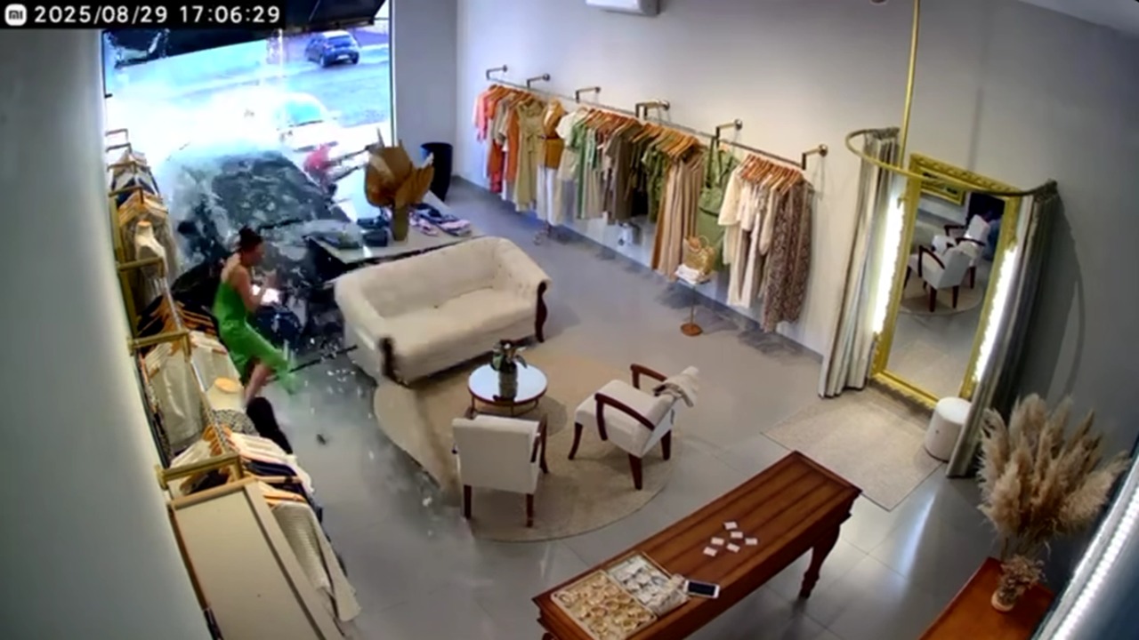 Com o impacto, o condutor do Ônix perde o controle e vai de encontro com a loja de roupas, invadindo o espaço e quase atingindo duas mulheres que estavam no interior do estabelecimento.