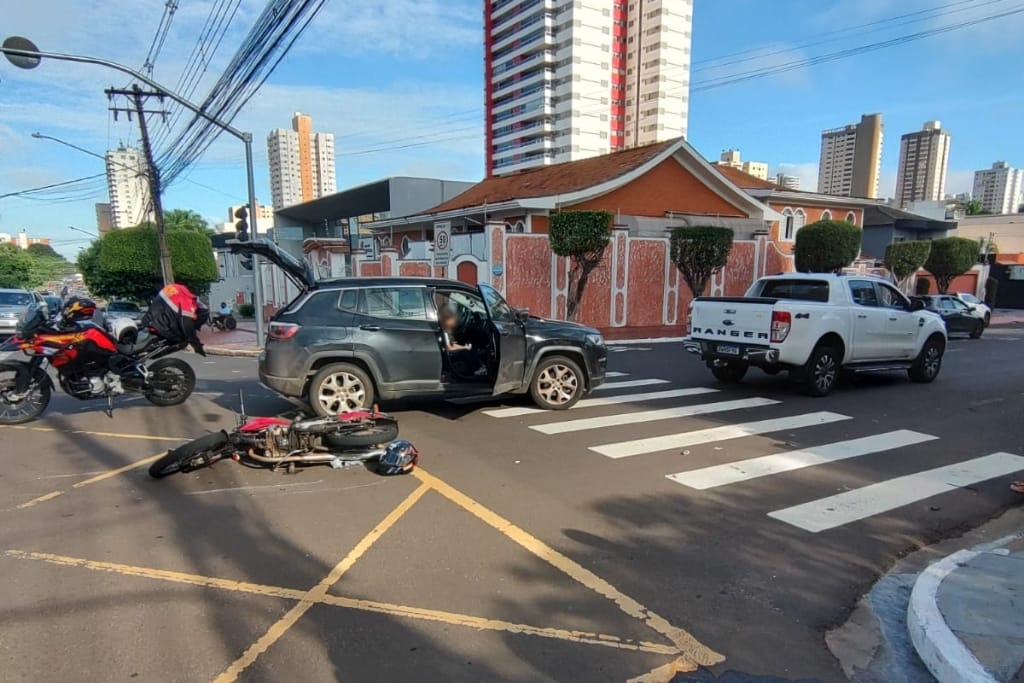 Um motociclista foi socorrido e encaminhado para a Santa Casa após se envolver em um acidente de trânsito na manhã desta quinta-feira (9), no cruzamento da rua Antônio Maria Coelho com a rua Bahia, em Campo Grande.